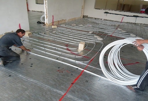 در گرمایش کف با آب گرم در هنگام ساخت ما لوله هایی را در داخل کف ساختمان تعبیه میکنیم و آب گرم را از داخل آن عبور میدهیم که باعث گرم شدن کف خواهد شد.